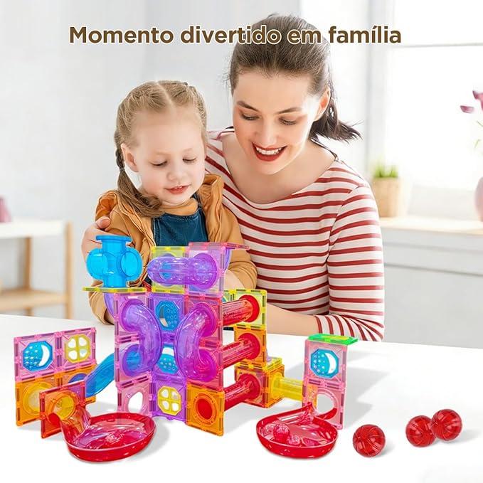Adicione ainda mais emoção com o marble run, que permite construir pistas dinâmicas onde as bolinhas deslizam, trazendo movimento e interatividade para as criações.